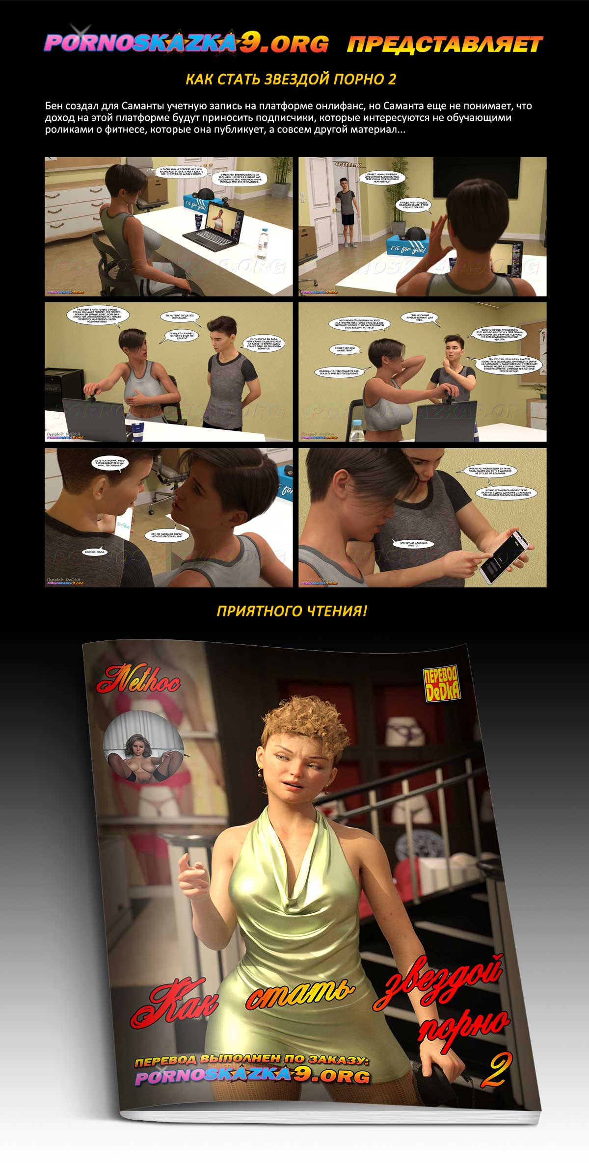 Порно комикс «Как стать звездой порно. Часть 2.» Мать Бена преподает в интернете уроки аэробики для женщин, и неплохо зарабатывает за счет того, что количество подписчиков не ее канал неуклонно растет. Но судя по тому, в какой одежде она ведет занятия, ее муж подозревает, что не меньше половины ее подписчиков, это не женщины, а мужчины, которых интересует вовсе не аэробика…