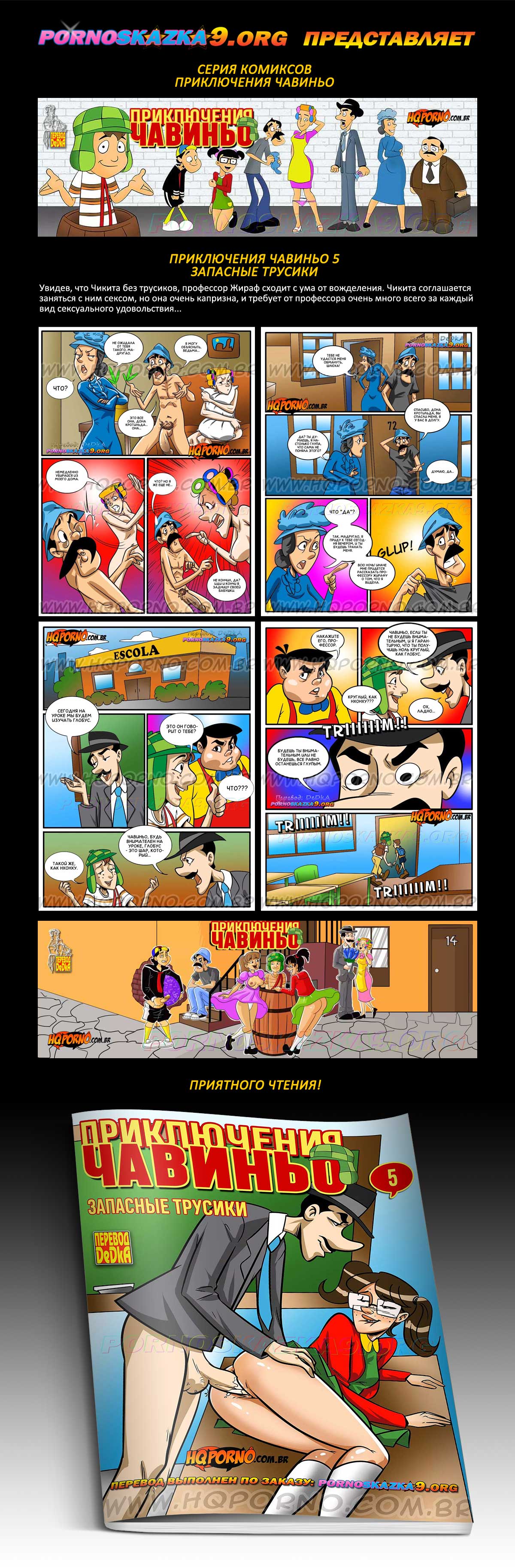Порно комикс «Приключения Чавиньо. Часть 5. Запасные трусики.» Увидев, что Чикита без трусиков, профессор Жираф сходит с ума от вожделения. Чикита соглашается заняться с ним сексом, но она очень капризна, и требует от профессора очень много всего за каждый вид сексуального удовольствия…